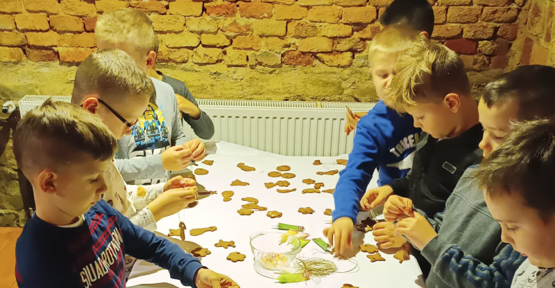 29 listopada uczniowie klasy 1 i 2 wzięli udział w warsztatach piernikowych w Kopytowej. Dzieci miały okazję samodzielnie wałkować ciasto, wykrawać, piec i dekorować pierniki. Pod czujnym okiem pań prowadzących zajęcia, dzieci wykazywały się pomysłowością w tworzeniu świątecznych ozdób na choinkę. W powietrzu unosił się pachnący piernikami świąteczny nastrój. Warsztaty połączone były z lekcją muzealną, na której uczniowie zwiedzali Muzeum Kultury Szlacheckiej i poznali wnętrza autentycznej tradycyjnej siedziby szlacheckiej z końca XVIII w.