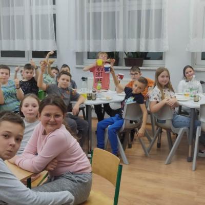Udział w programie SP! SERCE i POMOC ma na celu integrację klasy, a przede wszystkim pokonanie „progu szkolnego”, który pojawia po przejściu z klasy III do IV. Dlatego bardzo ważne jest stworzenie w tym czasie przyjaznego klimatu w szkole, na który składają się relacje uczeń – nauczyciel, nauczyciel – rodzice oraz tworzenie dobrego klimatu w grupie rówieśniczej. Jako nauczyciele dążymy do tego, żeby stworzyć dzieciom jak najlepsze warunki przystosowania się do zmienionej rzeczywistości. Mamy świadomość, że uczniowie wymagają wtedy szczególnej opieki ze strony dorosłych, oczekują otwartej i opiekuńczej postawy, pozwalającej bez zbytniego stresu i niepotrzebnych lęków przekroczyć próg między klasą III a klasą IV. Aby temu sprostać, już od września wychowawczyni - pani Joanna Ostrowicka zorganizowała spotkania z psychologiem zarówno dla uczniów, jak i dla rodziców. Miały one na celu wesprzeć uczniów w prawidłowym funkcjonowaniu w klasie i szkole. Chodziło o to, aby przekonać dzieci, że szkoła jest miejscem przyjaznym, a lepsze poznanie i integracja zespołu klasowego jest warunkiem zrozumienia potrzeb innych i ich akceptacji. Ostatnim, największym i najciekawszym dla wszystkich przedsięwzięciem, była organizacja “nocki w szkole”- w rodzaju szkolnego biwaku. 18 listopada 2022 roku, o godz. 18, zaopatrzeni w poduszki, śpiwory, a kto nie miał kołderki- stawili się na zbiórkę uczniowie i rodzice, którzy pomagali przynieść ekwipunek na to wyjątkowe nocowanie. Rodzice bardzo się zaangażowali, przynosząc cudowne bułeczki, proziaki, rogaliki i same pyszne rzeczy na wspólną kolację i śniadanie. Przed wyjściem dali swoim dzieciom całusy i życzyli wspaniałych wrażeń i dobrej nocy! Wszyscy zabrali się do organizacji miejsca do spania. Przynieśli do sali korekcyjnej materace i rozłożyli tam swoje rzeczy, wszystko odbywało się w przyjaznej i zgodnej atmosferze, nie było słychać kłótni o to, gdzie kto i koło kogo będzie spał. Po zakwaterowaniu się był czas na tańce, wspierane nowoczesną technologią przed ekranem telewizora, kto nie chciał tańczyć, rozgrywał mecz na piłkarzykach, albo przy planszówkach. Dla każdego coś fajnego. Podczas kolacji, wszyscy wspólnie częstowali się jedzeniem przygotowanym przez mamy. Każdy mógł pokosztować. Gwar, śmiech i żarty, wspólny posiłek wprawił wszystkich w dobry nastrój do nocnego kina w sali korekcyjnej, gdzie czekały już gotowe śpiwory i poduszki. Na początek ekranizacja lektury szkolnej w ciszy i skupieniu należnym lekturze. Dalej animowana komedia, która wszystkich śmieszyła . Ostatni film był dla wytrwałych. Dla tych, którym jeszcze nie chciało się spać, film o dziewczynce z odległego końca świata, której największym marzeniem- była jazda na deskorolce. Kto i na tym filmie nie zasnął, musiał pożegnać się i mimo wszystko ułożyć do snu! Sen przyszedł szybko! Krótka noc, zleciała jeszcze szybciej! O 7 rano komuś zadzwonił budzik, ale było zdziwienie, że to już, że już ranek. Jeszcze trochę rozmów, śmiechów, a potem trzeba było zacząć pakowanie swoich rzeczy i przygotować się do śniadania. Wszyscy samodzielnie obsługiwali się w kuchni. Dorośli czuwali nad ciepłymi napojami, dbając o bezpieczeństwo, żeby się nikt nie poparzył. Po śniadaniu wszyscy ochoczo zabrali się do sprzątania. Czas był bowiem na to, aby doprowadzić szkołę do porządku, żeby można było w poniedziałek normalnie się uczyć!