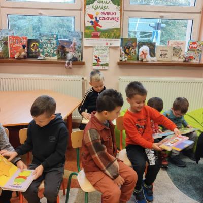 Z wielką radością przywitała nas dyrektor biblioteki, pani Angelika Królicka, która wprowadziła dzieci w świat pełen magii – wśród półek uginających się od książek i książeczek. Przedszkolaki z ogromnym zainteresowaniem oglądały zbiory znajdujące się na półkach. Szczególną uwagę przyciągnął dział dla najmłodszych, gdzie mali czytelnicy z ciekawością przeglądali kolorowe książeczki proponowane przez panią bibliotekarkę.