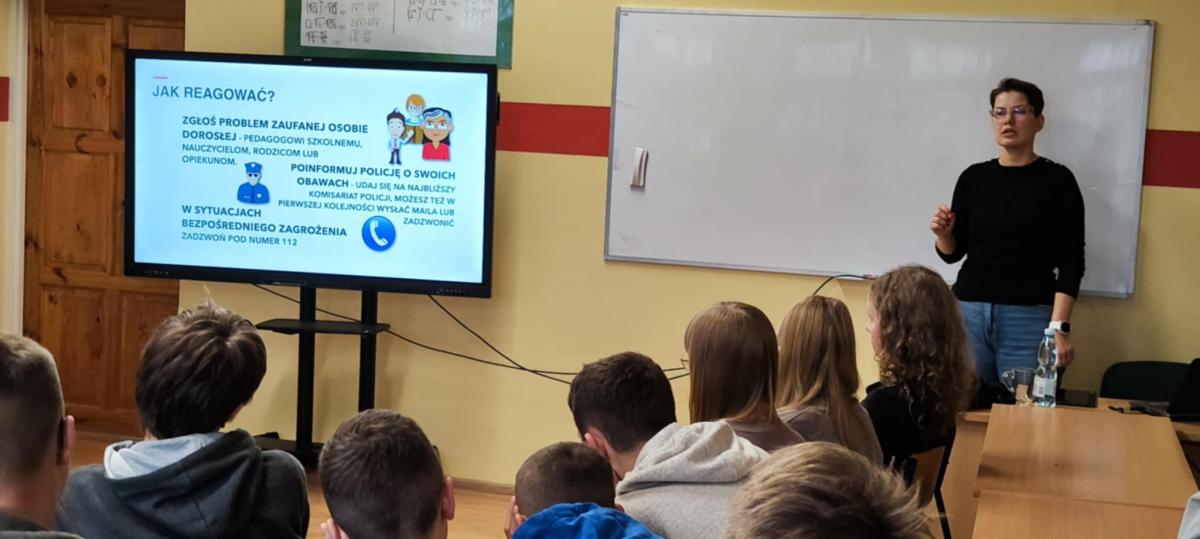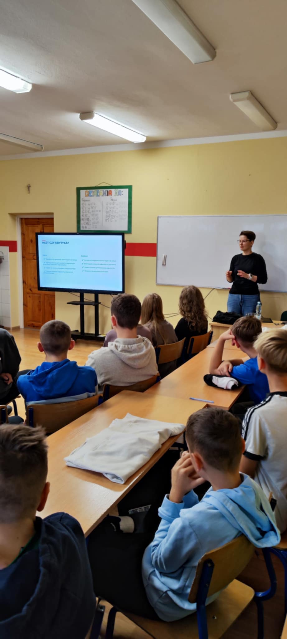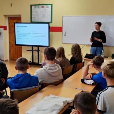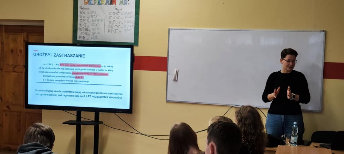 Młodzież aktywnie uczestniczyła w dyskusji, zadawała pytania i dzieliła się swoimi spostrzeżeniami. Spotkanie okazało się nie tylko pouczające, ale też inspirujące, pokazujące, jak ważna jest świadomość prawna i odpowiedzialne korzystanie z mediów społecznościowych.