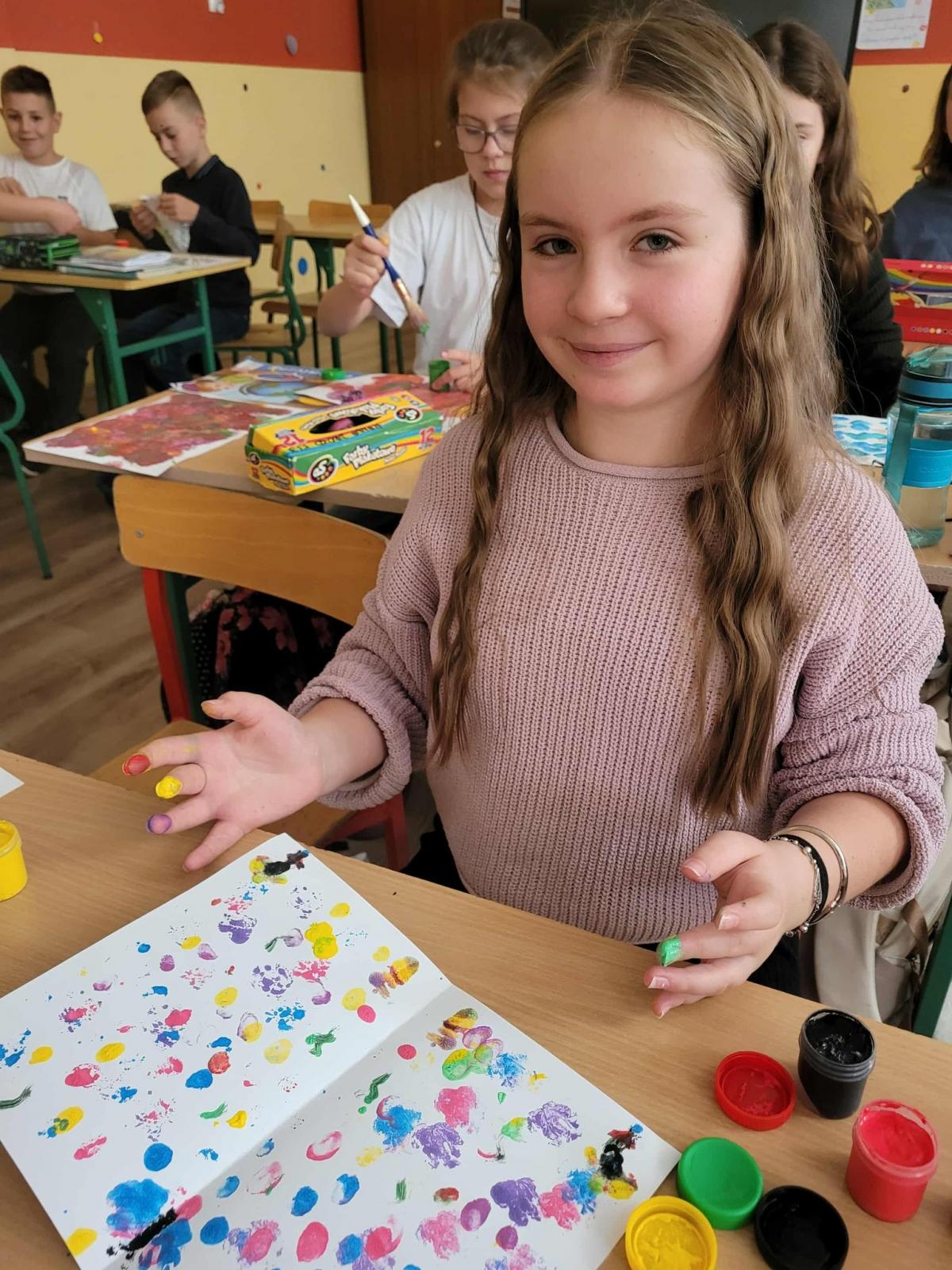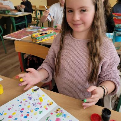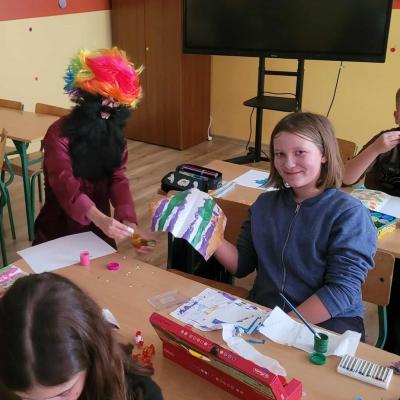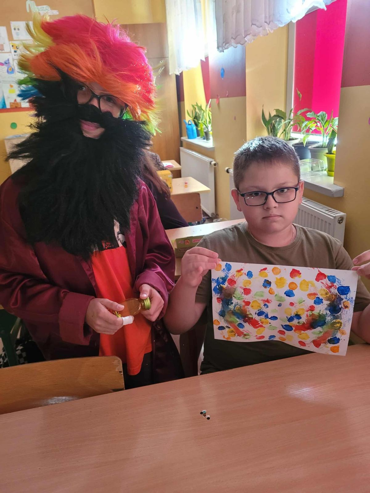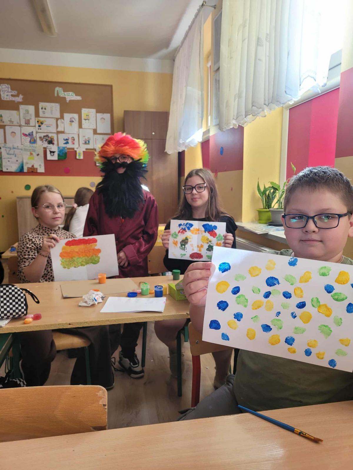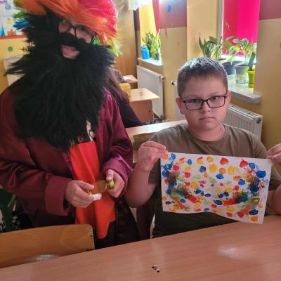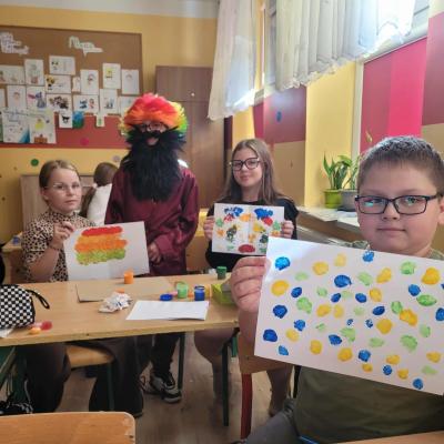 Spotkanie z lekturą "Akademia Pana Kleksa " stało się okazją do wypróbowania niezwykłych metod profesora. Dlatego też lekcja języka polskiego w klasie czwartej zamieniła się w lekcję kleksografii. Dzieci przyniosły kolorowe farby, pędzle, kartki i przeniosły się w świat fantazji. Uczniowie tworzyli barwne kleksy, co dawało im mnóstwo frajdy i zadowolenia. Nad ich pracą czuwał "pan Kleks", który za zaangażowanie wynagradzał uczniów "piegami". Lekcja kleksografii uruchomiła kreatywność i inwencje twórcze dzieci, wyzwoliła emocje, które sprawiły, że poczuły się jak prawdziwi uczniowie magicznej Akademii.