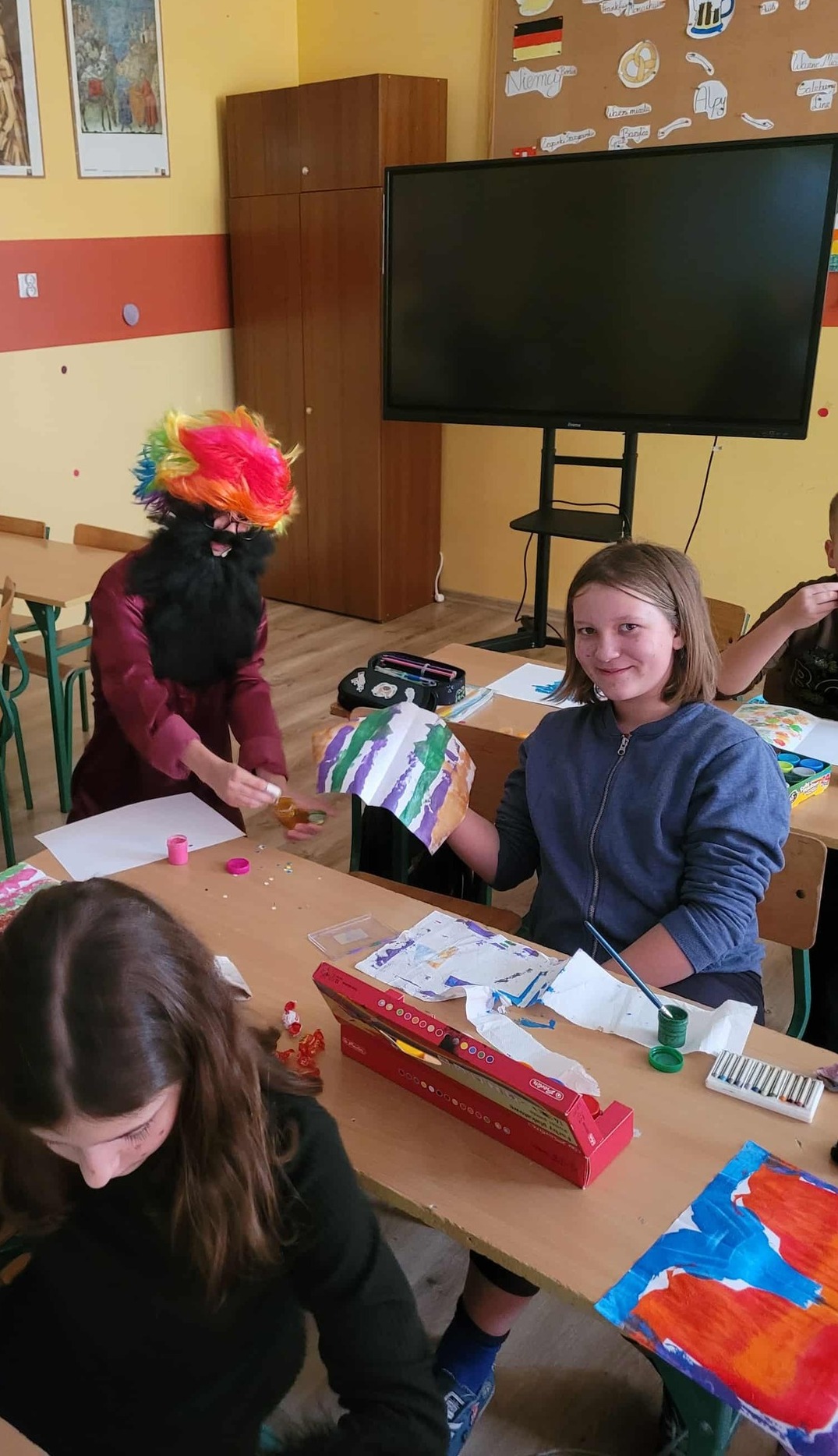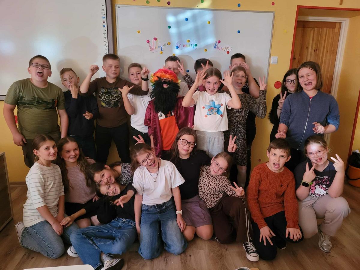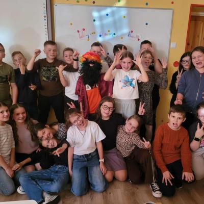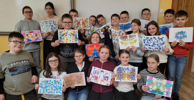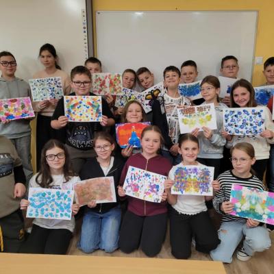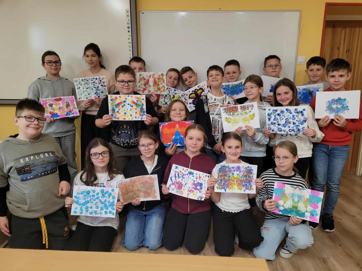 Spotkanie z lekturą "Akademia Pana Kleksa " stało się okazją do wypróbowania niezwykłych metod profesora. Dlatego też lekcja języka polskiego w klasie czwartej zamieniła się w lekcję kleksografii. Dzieci przyniosły kolorowe farby, pędzle, kartki i przeniosły się w świat fantazji. Uczniowie tworzyli barwne kleksy, co dawało im mnóstwo frajdy i zadowolenia. Nad ich pracą czuwał "pan Kleks", który za zaangażowanie wynagradzał uczniów "piegami". Lekcja kleksografii uruchomiła kreatywność i inwencje twórcze dzieci, wyzwoliła emocje, które sprawiły, że poczuły się jak prawdziwi uczniowie magicznej Akademii.