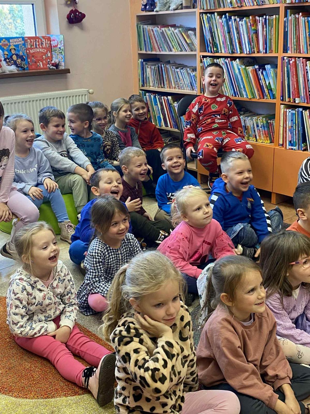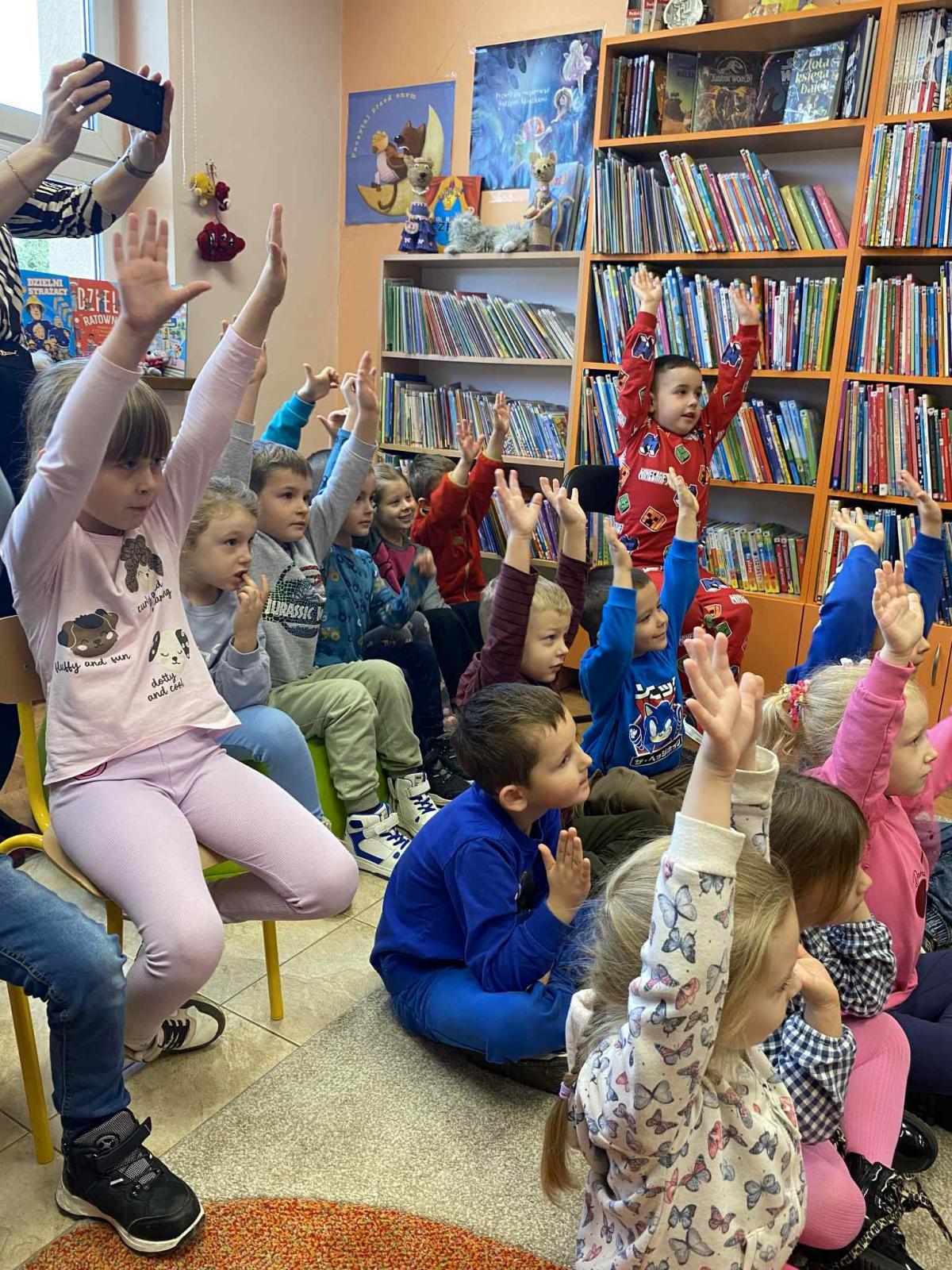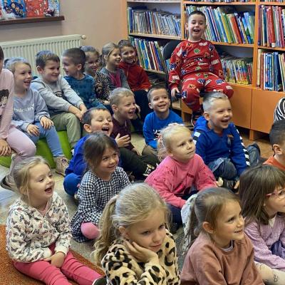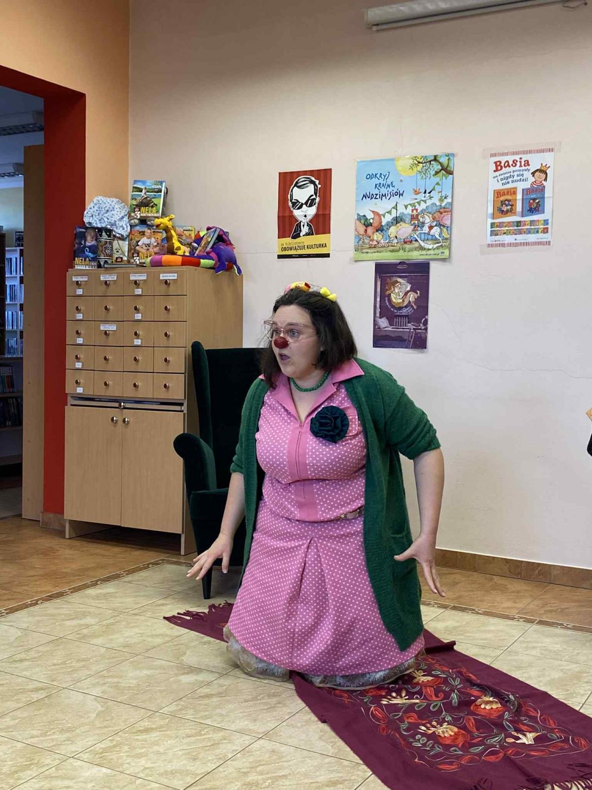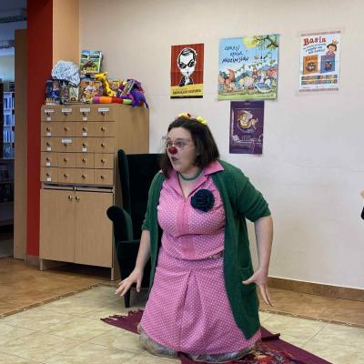 W dniu 13.11.2025r. dzieci z grup pięcio- i sześciolatków skorzystały z zaproszenia pani bibliotekarki z Biblioteki w Nowotańcu i punktualnie o godzinie 10.00 stawiły się na spektakl pt. „Clown Book”. Tuż po wejściu do biblioteki dzieci czekały z niecierpliwością na niespodziankę i z wielką radością powitały ciocię Krysię Przeczytałę. Bohaterka spotkania serdecznie powitała dzieci, a swoimi zabawnymi wypowiedziami i śmiesznymi zachowaniami wywoływała salwy śmiechu na sali. Ten interaktywny spektakl przeniósł wszystkich do niezwykłego salonu cioci Krystyny. Było to miejsce pełne książek, lekkiego chaosu i … królika Franka, który zasypia tylko w określonych sytuacjach. Wśród tych potrzebnych do zaśnięcia elementach znalazły się: magiczna zielona czapka cioci Krysi, szumiące drzewo za oknem, stara gitara po pradziadku oraz kołysanka. Ciocia Krysia do tego ważnego zadania zaangażowała wszystkie dzieci uczestniczące w spotkaniu. Trzeba dodać, że ciocia ma jedną cechę, która komplikowała rytuał usypiania królika Franka. Jest z natury clownem, myli przedmioty, wciąż popełnia gafy, a jej czerwony nos potwierdza, że nic nie pójdzie zgodnie z planem. Do uśpienia królika potrzebna była historyjka, którą tworzyły dzieci a ciocia Krysia zamieniła ją w piękną kołysankę. Franek zasnął spokojnie a ciocia Krysia mogła spokojnie pójść do pracy. Okazało się, że jest lekarzem- clownem, pracującym w szpitalu i pomagającym chorym dzieciom w trudnym czasie pobytu w szpitalu. Przez zabawne sytuacje i śmieszne teksty łatwiej chorym dzieciom przebywać na leczeniu. Dziękujemy za zaproszenie i piękny spektakl, za uśmiech i radość i wspaniale spędzony czas.