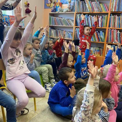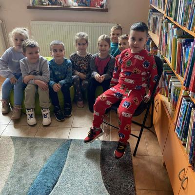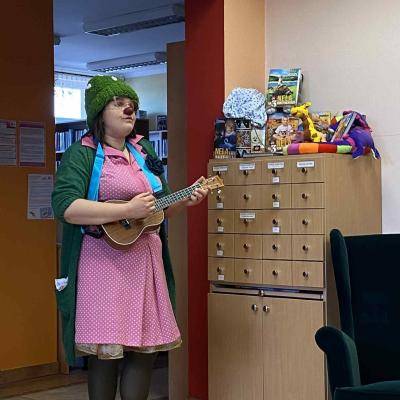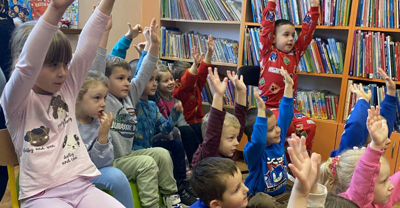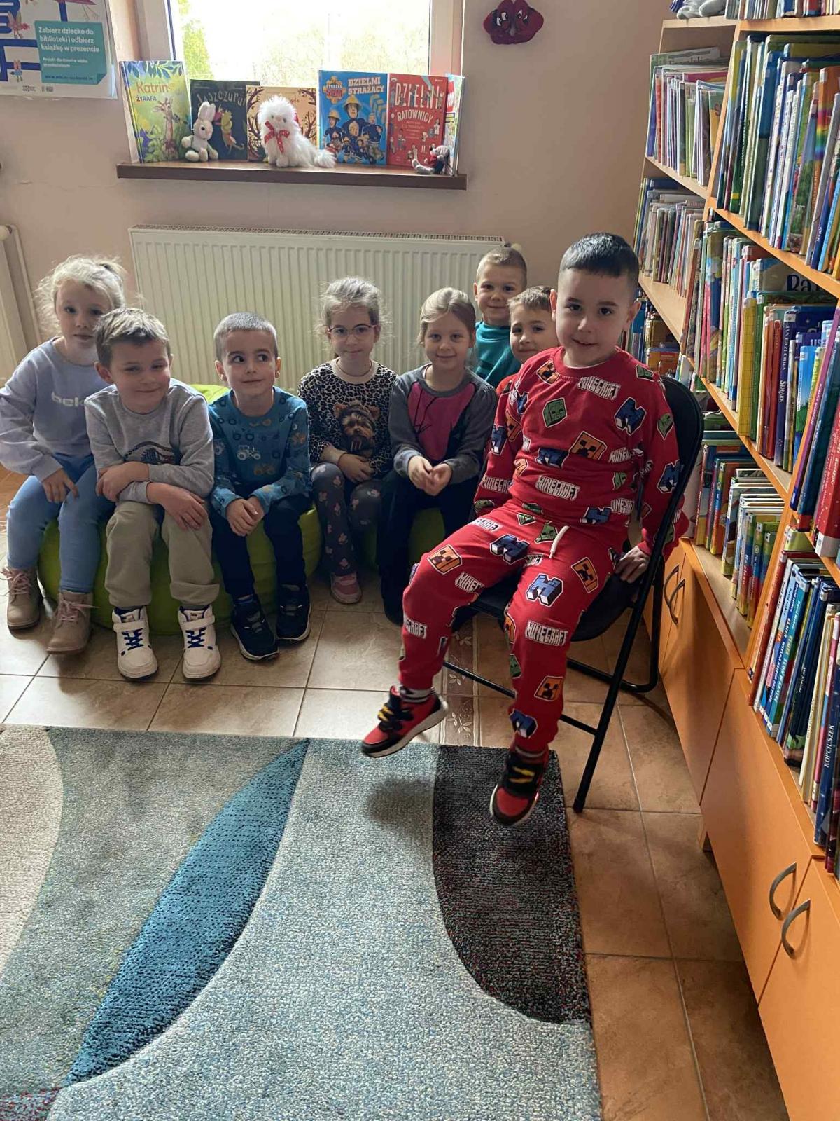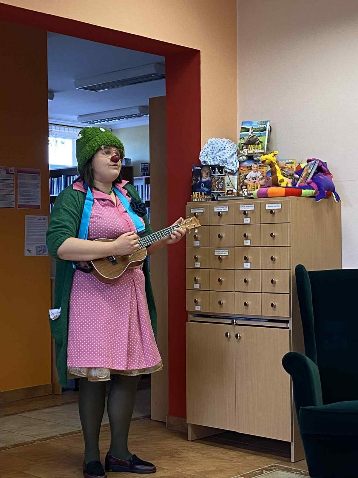 W dniu 13.11.2025r. dzieci z grup pięcio- i sześciolatków skorzystały z zaproszenia pani bibliotekarki z Biblioteki w Nowotańcu i punktualnie o godzinie 10.00 stawiły się na spektakl pt. „Clown Book”. Tuż po wejściu do biblioteki dzieci czekały z niecierpliwością na niespodziankę i z wielką radością powitały ciocię Krysię Przeczytałę. Bohaterka spotkania serdecznie powitała dzieci, a swoimi zabawnymi wypowiedziami i śmiesznymi zachowaniami wywoływała salwy śmiechu na sali. Ten interaktywny spektakl przeniósł wszystkich do niezwykłego salonu cioci Krystyny. Było to miejsce pełne książek, lekkiego chaosu i … królika Franka, który zasypia tylko w określonych sytuacjach. Wśród tych potrzebnych do zaśnięcia elementach znalazły się: magiczna zielona czapka cioci Krysi, szumiące drzewo za oknem, stara gitara po pradziadku oraz kołysanka. Ciocia Krysia do tego ważnego zadania zaangażowała wszystkie dzieci uczestniczące w spotkaniu. Trzeba dodać, że ciocia ma jedną cechę, która komplikowała rytuał usypiania królika Franka. Jest z natury clownem, myli przedmioty, wciąż popełnia gafy, a jej czerwony nos potwierdza, że nic nie pójdzie zgodnie z planem. Do uśpienia królika potrzebna była historyjka, którą tworzyły dzieci a ciocia Krysia zamieniła ją w piękną kołysankę. Franek zasnął spokojnie a ciocia Krysia mogła spokojnie pójść do pracy. Okazało się, że jest lekarzem- clownem, pracującym w szpitalu i pomagającym chorym dzieciom w trudnym czasie pobytu w szpitalu. Przez zabawne sytuacje i śmieszne teksty łatwiej chorym dzieciom przebywać na leczeniu. Dziękujemy za zaproszenie i piękny spektakl, za uśmiech i radość i wspaniale spędzony czas.