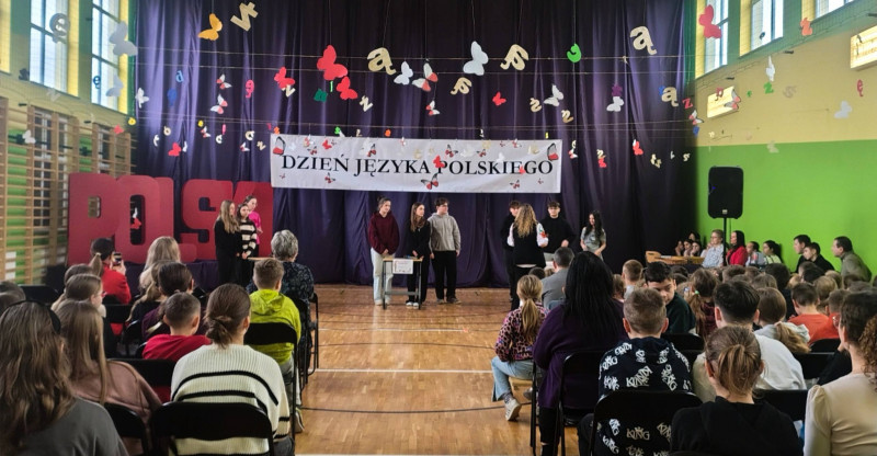 Program artystyczny był niezwykle różnorodny i pełen energii. Czwartoklasiści z powodzeniem zadebiutowali piosenką „Żółta żaba żarła żur”, udowadniając, że językowe łamańce mogą być świetną zabawą. Publiczność obejrzała również kabaretowy skecz „Jadłopodawca” oraz humorystyczne przedstawienie „Ach ta dzisiejsza młodzież”, które z przymrużeniem oka ukazało różnice pokoleniowe i zmiany w sposobie komunikowania się. Nie zabrakło także występów muzycznych, uczniowie zaprezentowali utwory „Dykcja”, „Łamaniec” oraz interpretację wiersza „Nic dwa razy”, pokazując piękno i melodyjność polszczyzny w różnych odsłonach. Finałem części artystycznej był efektowny taniec z wachlarzami do utworu „Victory” w wykonaniu uczennic klasy VI.