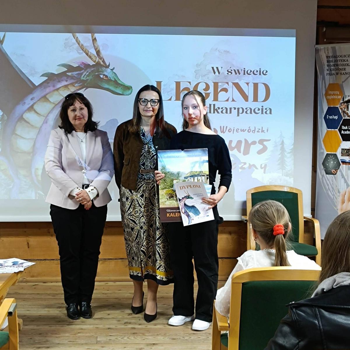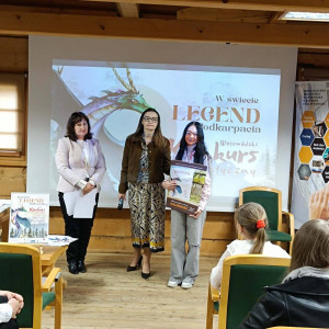 Dzisiaj uczestniczki wojewódzkiego konkursu plastyczno- czytelniczego z naszej szkoły uczestniczyły w gali podsumowującej go w sanockim Skansenie. Pomysłodawczyniami tego przedsięwzięcia były nauczycielki z Zespołu Szkół w Bukowsku. Patronat nad nim objęły zaś Podkarpackie Centrum Edukacji Nauczycieli oraz Pedagogiczna Biblioteka Wojewódzka w Krośnie – Filia w Sanoku. Konkurs miał na celu przede wszystkim upowszechnienie legend Podkarpacia oraz pokazanie, że można je opowiedzieć uniwersalnym językiem sztuk plastycznych w bardzo różnych formach. W gronie 87 osób, które znalazły się w II etapie - wojewódzkim - są trzy nasze uczennice. W kategorii klas VII- VIII Aleksandra Kielniak i Anastazja Maczużak, zaś w kategorii klas IV -VI Hanna Drozd, która zdobyła wyróżnienie. Wszystkim uczestniczkom DZIĘKUJEMY i SERDECZNIE GRATULUJEMY