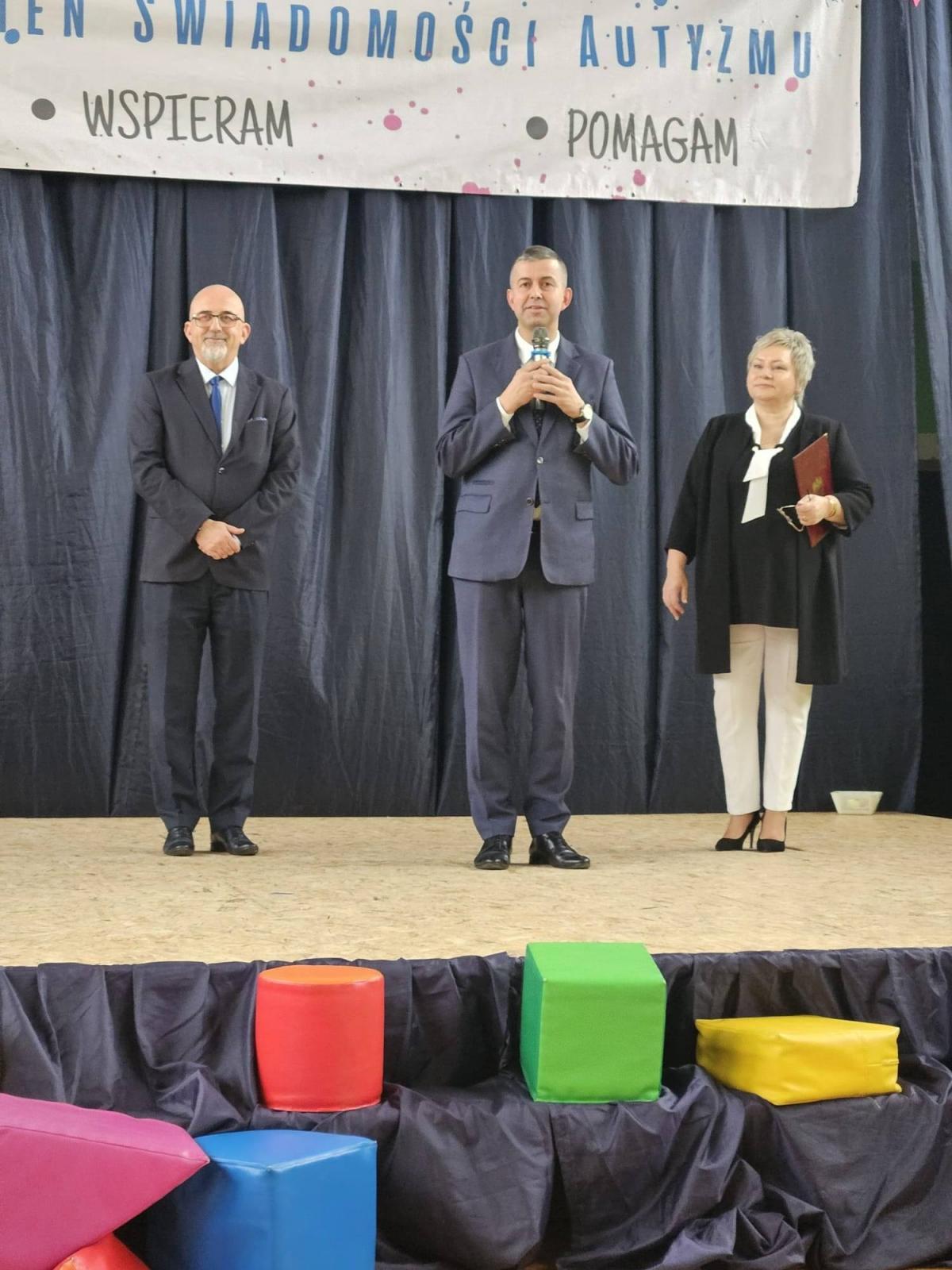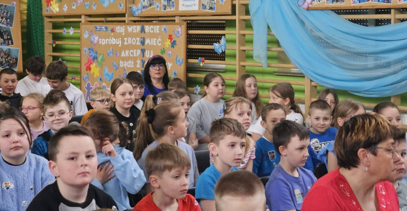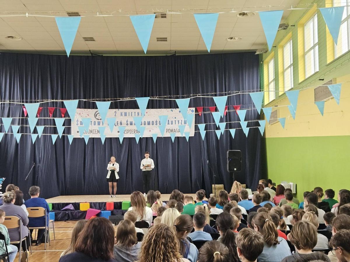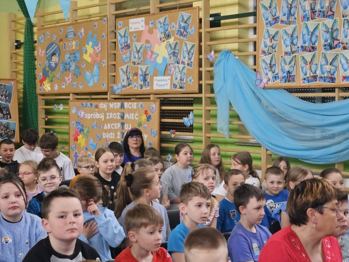 W tańcach uczennice klas 6 i 7 przedstawiły to, czego nie można wyrazić słowami: bliskość, integrację, radość i smutek. Sonia w pięknej, wymownej i wzruszającej piosence wprowadziła nas w zadumę. Uczniowie klasy 4, którzy byli głównymi organizatorami tej uroczystości, w śpiewanych piosenkach i mini przedstawieniu pt. „Z życia mamy”, pokazali, jak właściwie wygląda rzeczywistość i życie osób w spektrum autyzmu i jak „…doradców i oceniających dookoła jest wielu, a gdzieś pośrodku stoi rodzic, zmęczony, przerażony, chcący zrobić wszystko, by pomóc swojemu dziecku…”. Mocne słowa, które padły w wywiadzie Laury (uczennicy, która wcieliła się w rolę dziennikarki) z Mamą chłopca ze spektrum uświadomiły nam, z jak wieloma problemami borykają się opiekunowie na co dzień, jak walczą z brakiem wiedzy na temat autyzmu. Wszystkich wzruszył ten wywiad, w którym bez scenariusza i reżyserki Mama odpowiadała na pytania związane z codziennym życiem z dzieckiem w spektrum, opowiadała jak zmieniła Ją rola mamy, jaką jest teraz osobą: „…Mnie już nie ma jako ja, jesteśmy razem ja i moje dziecko, jesteśmy jedno, nie ma mnie bez niego i jego beze mnie…” (cytat). Padło też pytanie o marzenia dla Niej i Syna: „… Ja nie mam marzeń dla siebie, tylko jedno dla Syna, aby kiedy mnie zabraknie, umiał poradzić sobie w życie… „(cytat). Na ręce Mamy Sylwii złożyliśmy symboliczne kwiaty jako wyraz naszego podziękowania i wdzięczności dla wszystkich Mam, które codziennie walczą o normalne życie dla swoich dzieci, walczą z systemem, polityką i ludźmi, którzy nie znając tematu tak łatwo oceniają i krytykują!